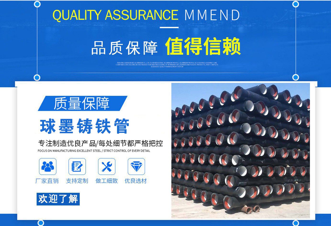 山西飛翔鑄業有限公司是一家以新興技術致力于研制開發(fā)、生產、銷售、施工安裝各種球墨管廠家,球墨鑄鐵管價格,國標球墨管,k9球墨鑄鐵管,國標球墨鑄鐵管,離心球墨鑄鐵管等系列鑄鐵產品。公司擁有完善的銷售、售后服務體系及一支由鑄造專家、工程師組成的精通產品設備和生產鑄造的技術力量隊伍。隨著企業的發(fā)展,我們積累了豐富的鑄造經驗與科技水平。使得產品具有高強度、高韌性、耐腐蝕性強等性能。同時,我們獲得質量管理體系認證、產品質量認證、職業健康體系認證、環(huán)境管理體系認證。產品暢銷各地并打入韓國、新加坡等東南亞市場。 在未來的發(fā)展中,公司奉行誠信共雙贏,合作創盛世的企業理念。讓我們一起共創美好未來!  公司產品采用良好的工藝流程,以確保產品質量的穩(wěn)定性:以良好的設備,確保質量的可靠性。廣泛應用于國內外城市的市政建設,通信,自來水,消防,園林,環(huán)保等行業,產品大獲贊譽!  我們有多年的井蓋生產經驗,多名老技術工人有將近二十年的生產經驗,還聘請多名新技術研發(fā)人員,因為我們始終堅信質量才是未來生存的根本,只有把質量保證了,企業才會有更加美好的未來。公司堅持用心服務,誠信為本,與時俱進,科技為先的企業理念,堅持科技先導、竭誠為廣大用戶服務。歡迎各界朋友蒞臨我公司參觀,指導洽談業務,相信選擇我們就是選擇我們共贏的明天...